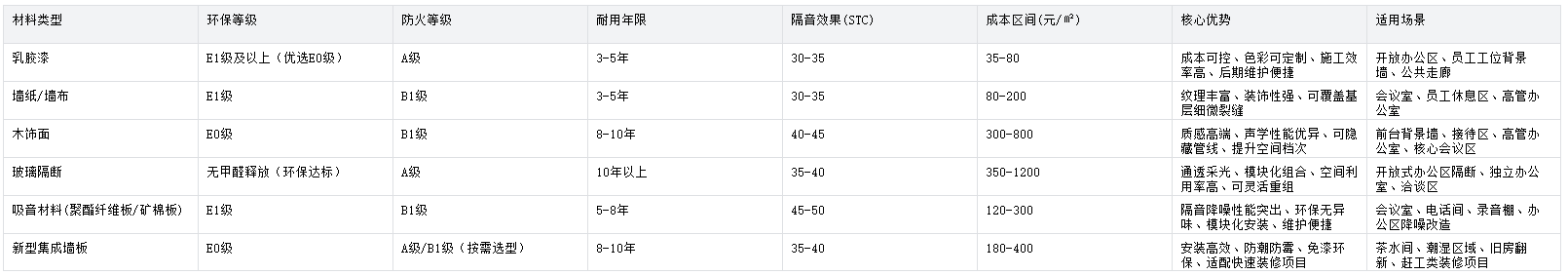当前办公室装修中,主流墙面材料可划分为乳胶漆、墙纸/墙布、木饰面、玻璃隔断、专业吸音材料及新型集成墙板六大类。各类材料在环保等级、防火性能、耐用年限、声学指标及成本控制等核心维度存在明确差异,具体参数对比如下表所示,为企业选型提供数据支撑: